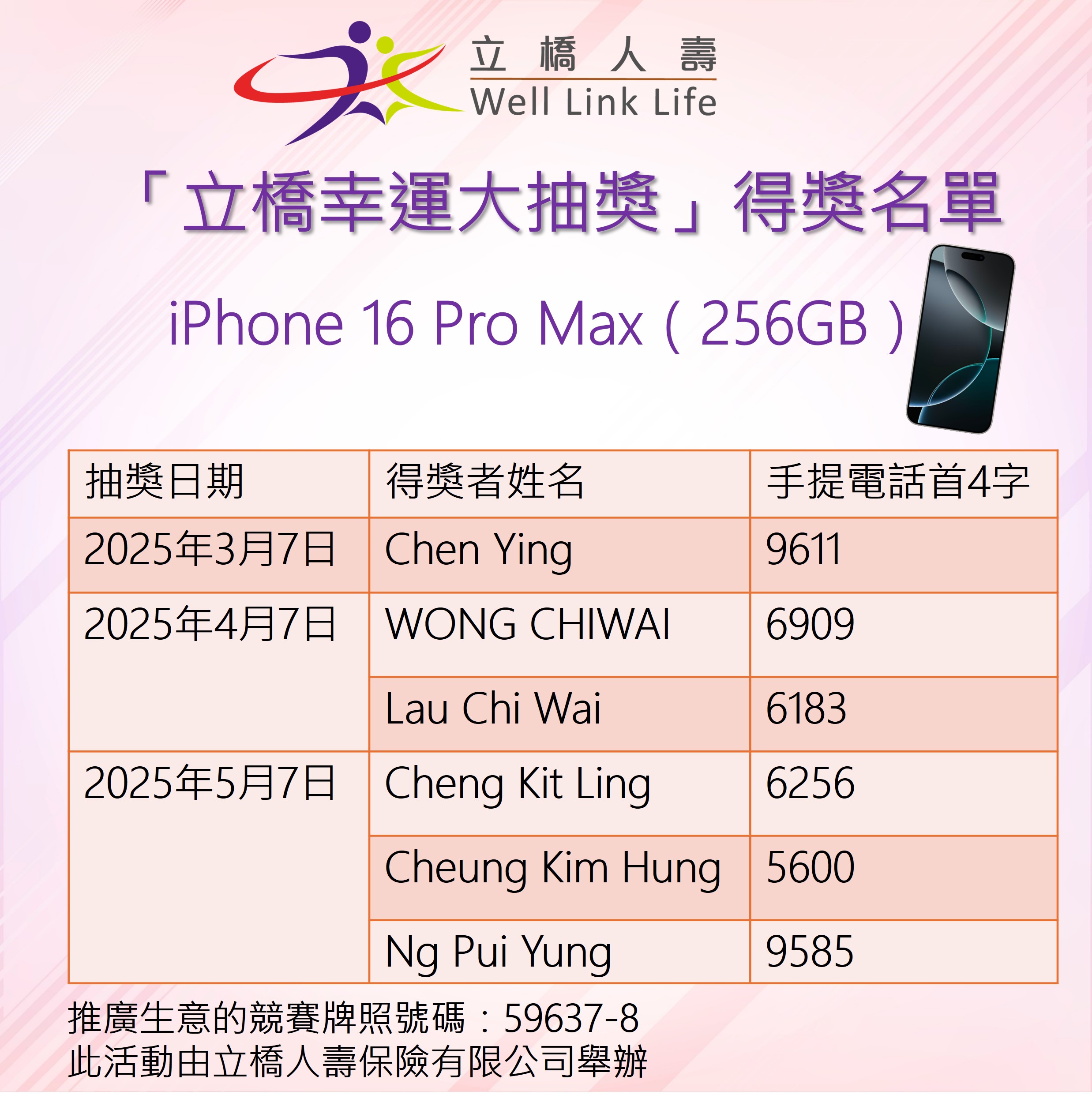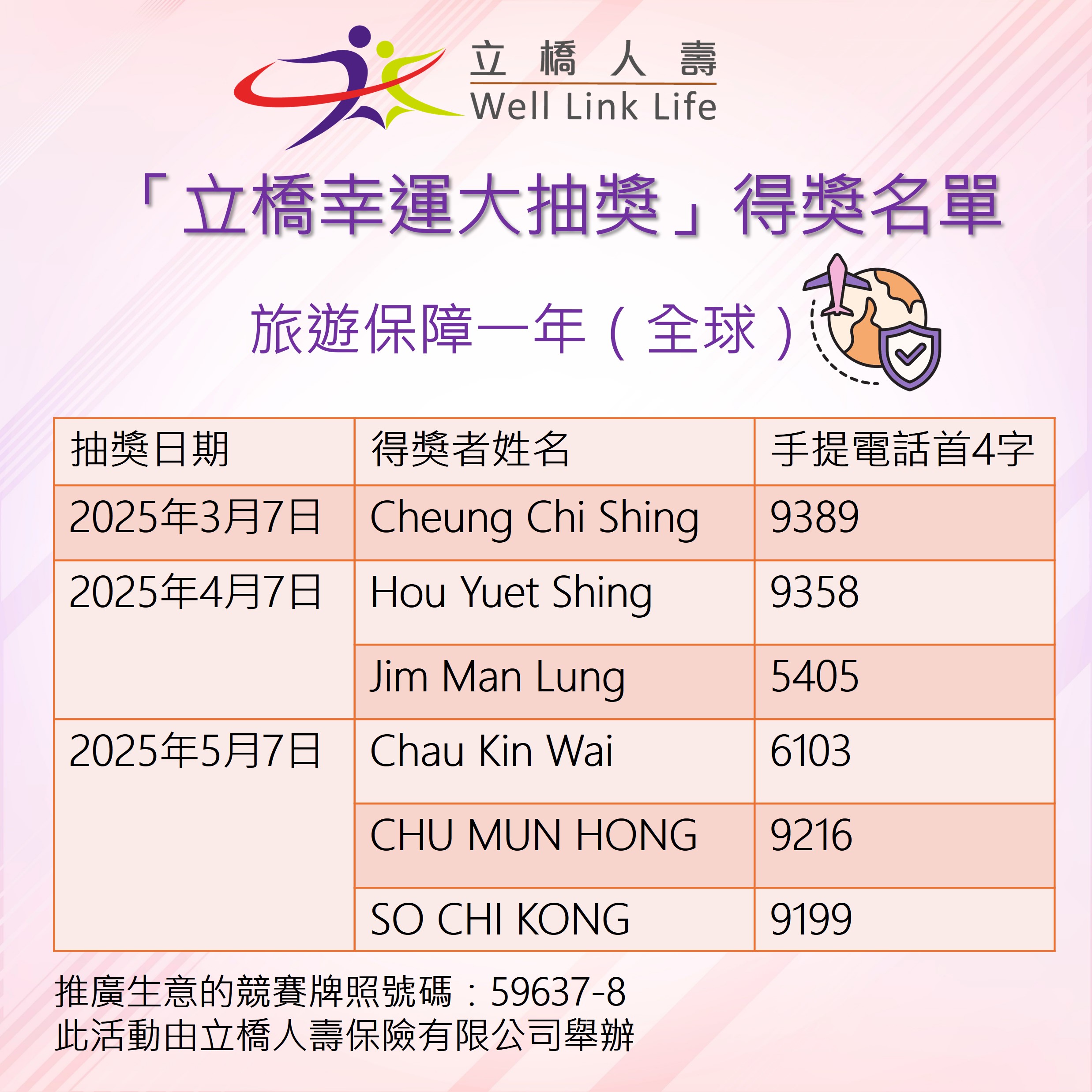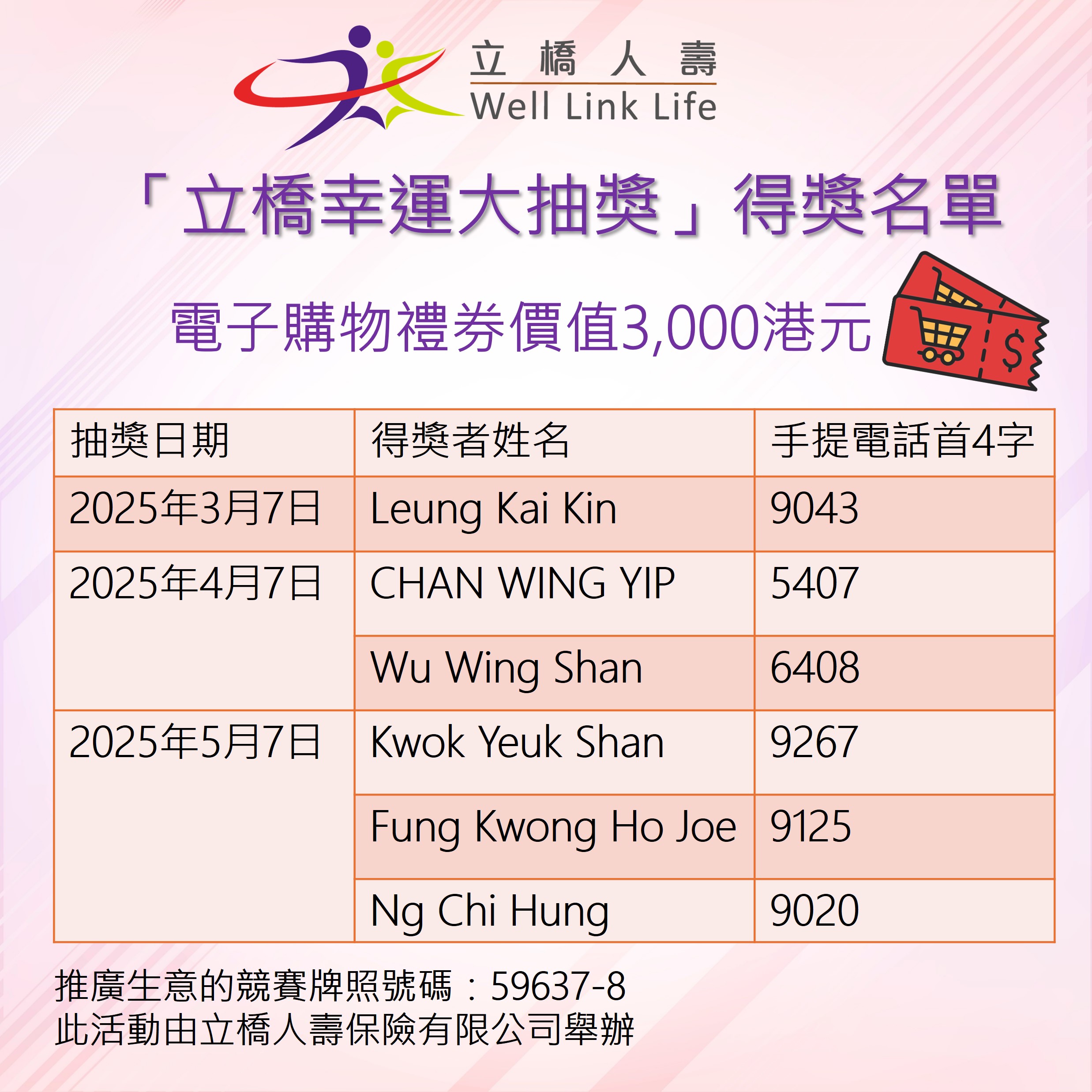 得獎者將會收到專人通知有關領獎事宜。如有查詢,歡迎聯絡立橋人壽。